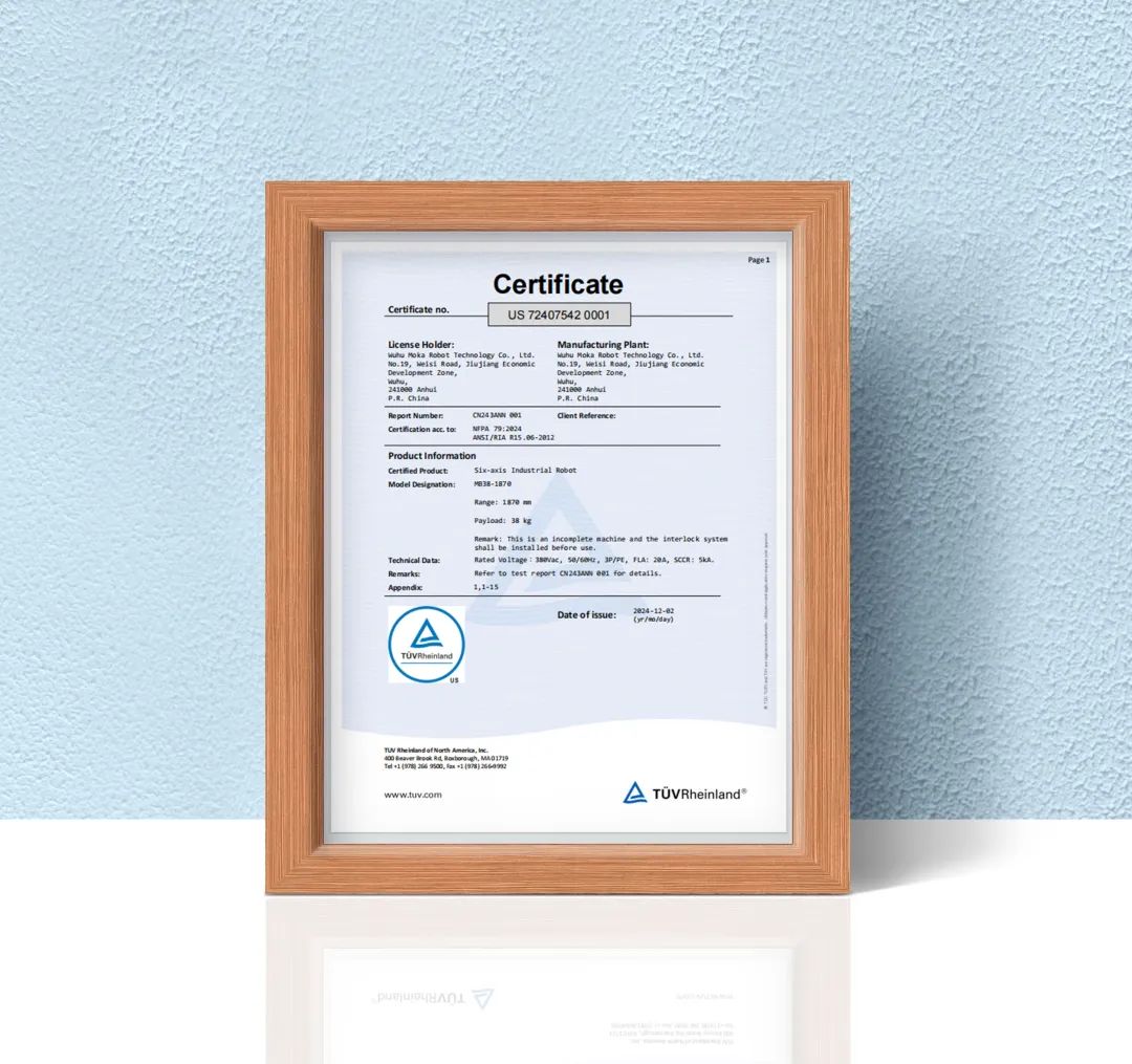 藦卡機器人取得北美認證證書意味著工業機器人產品的安全和品質滿足其銷售的要求,為加速進入北美市場,賦能更多行業應用獲取了快速通行證。